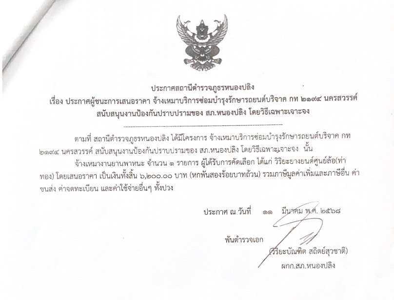 ประกาศสถานีตำรวจภูธรหนองปลิง เรื่อง ประกาศผู้ชนะการเสนอราคา จ้างเหมาบริการซ่อมบำรุงรักษารถยนต์บริจาค กท ๒๑๙๔ ของ สภ.หนองปลิง โดยวิธีเฉพาะเจาะจง เดือน มี.ค.68