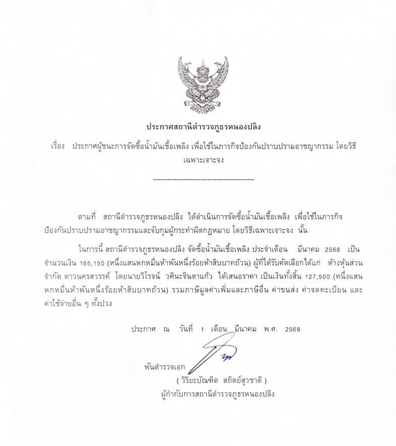 ประกาศสถานีตำรวจภูธรหนองปลิง เรื่อง ประกาศผู้ชนะการเสนอราคาจัดซื้อน้ำมันเชื้อเพลิง เพื่อใช้ในภารกิจป้องกันปราบปรามอาชญากรรม โดยวิธีเฉพาะเจาะจง เดือน มี.ค.68