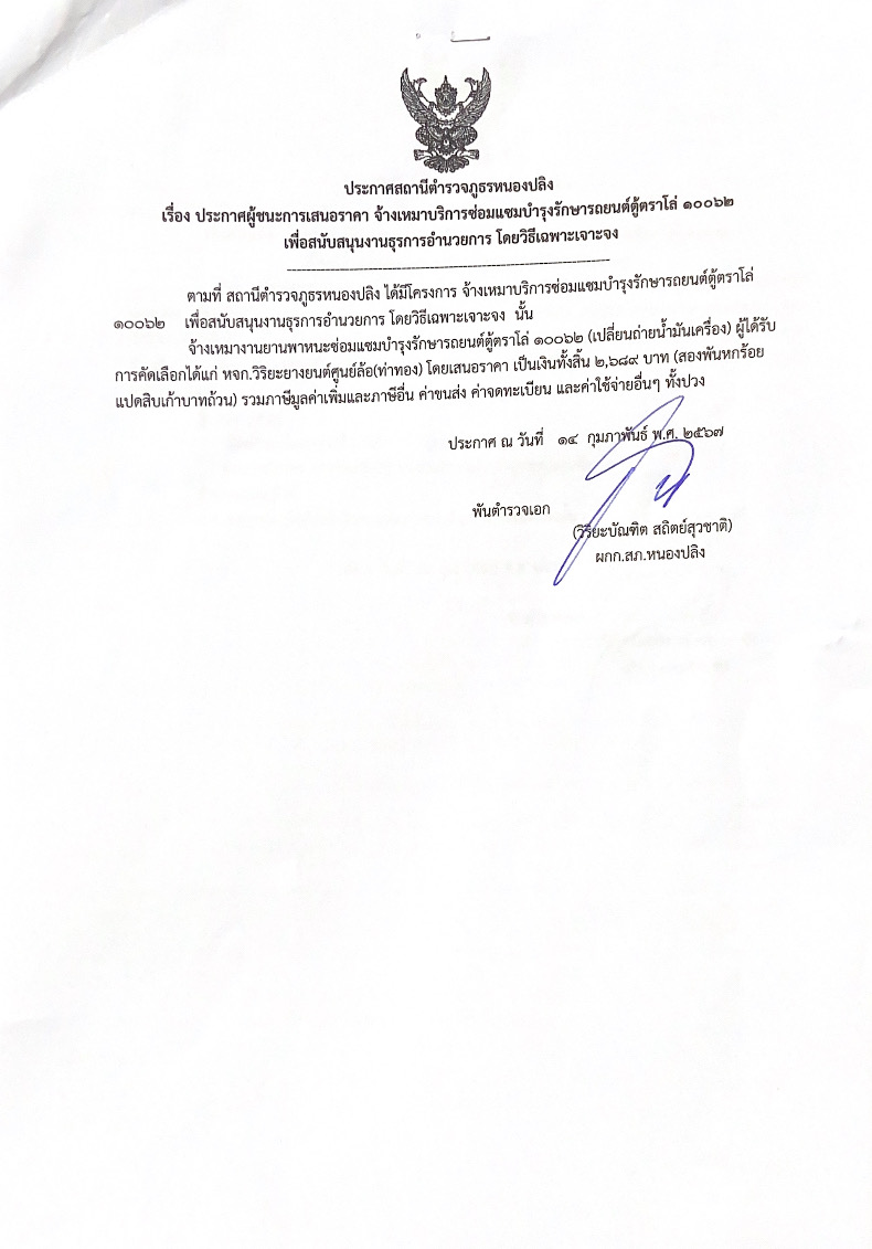 ประกาศสถานีตำรวจภูธรหนองปลิง เรื่อง ผู้ชนะการเสนอราคา จ้างเหมาบริการซ่อมแซ่มบำรุงรักษารถยนต์ตู้ตราโล่ 10062 โดยวิธีการเฉพาะเจาะจง เดือน ก.พ.67
