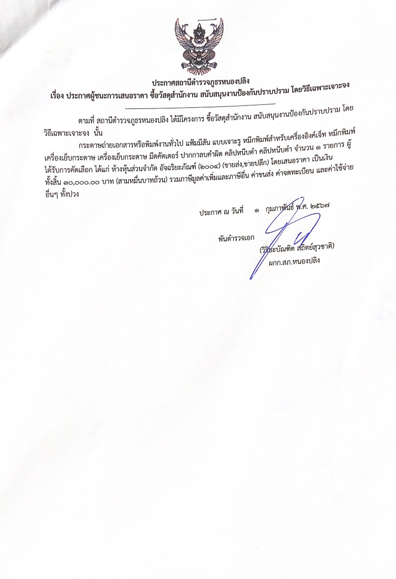 ประกาศสถานีตำรวจภูธรหนองปลิง เรื่อง ผู้ชนะการเสนอราคา ซื้อวัสดุสำนักงาน สนับสนุนงานป้องกันปราบปราม โดยวิธีการเฉพาะเจาะจง เดือน ก.พ.67
