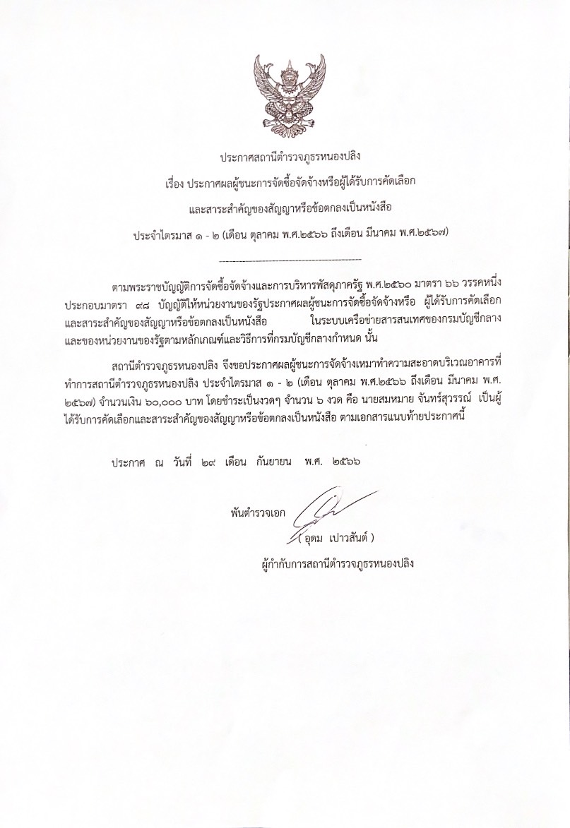 ประกาศสถานีตำรวจภูธรหนองปลิง เรื่อง ประกาศผู้ชนะการเสนอราคาจ้างเหมาทำความสะอาดอาคารที่ทำการสถานีตำรวจภูธรหนองปลิง โดยวิธีเฉพาะเจาะจง เดือน มี.ค.67
