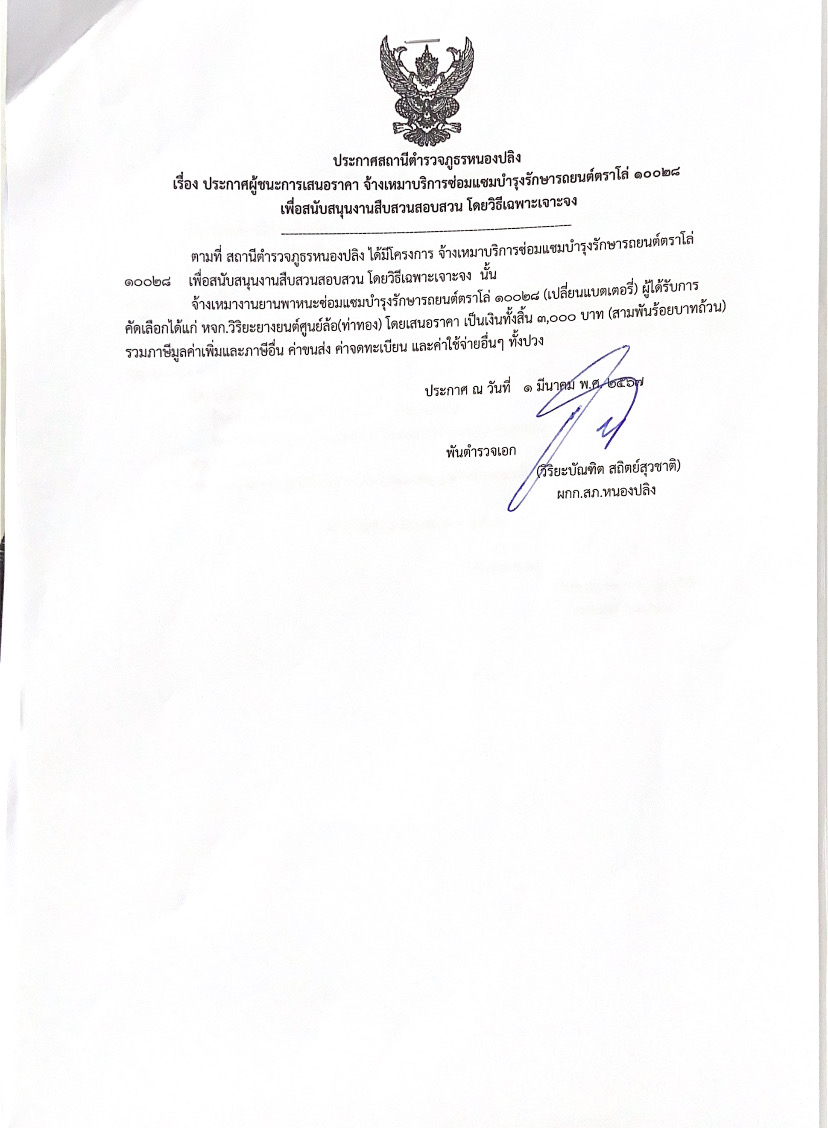 ประกาศสถานีตำรวจภูธรหนองปลิง เรื่อง ผู้ชนะการเสนอราคา จ้างเหมาบริการซ่อมแซ่มบำรุงรักษารถยนต์ตราโล่ 10028 เพื่อสนับสนุนงานสืบสวนสอบสวน โดยวิธีการเฉพาะเจาะจง เดือน มี.ค.67