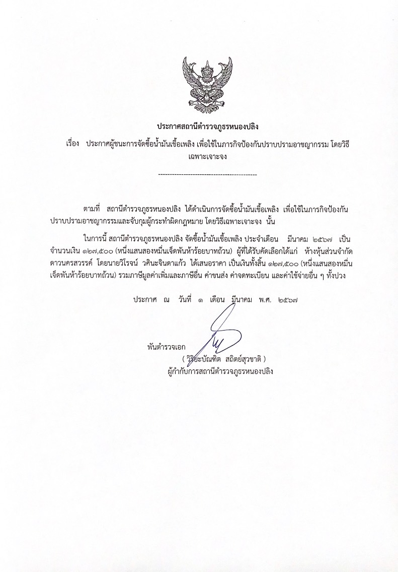 ประกาศสถานีตำรวจภูธรหนองปลิง เรื่อง ประกาศผู้ชนะการเสนอราคาจัดซื้อน้ำมันเชื้อเพลิง เพื่อใช้ในภารกิจป้องกันปราบปรามอาชญากรรม โดยวิธีเฉพาะเจาะจง เดือน มี.ค.67