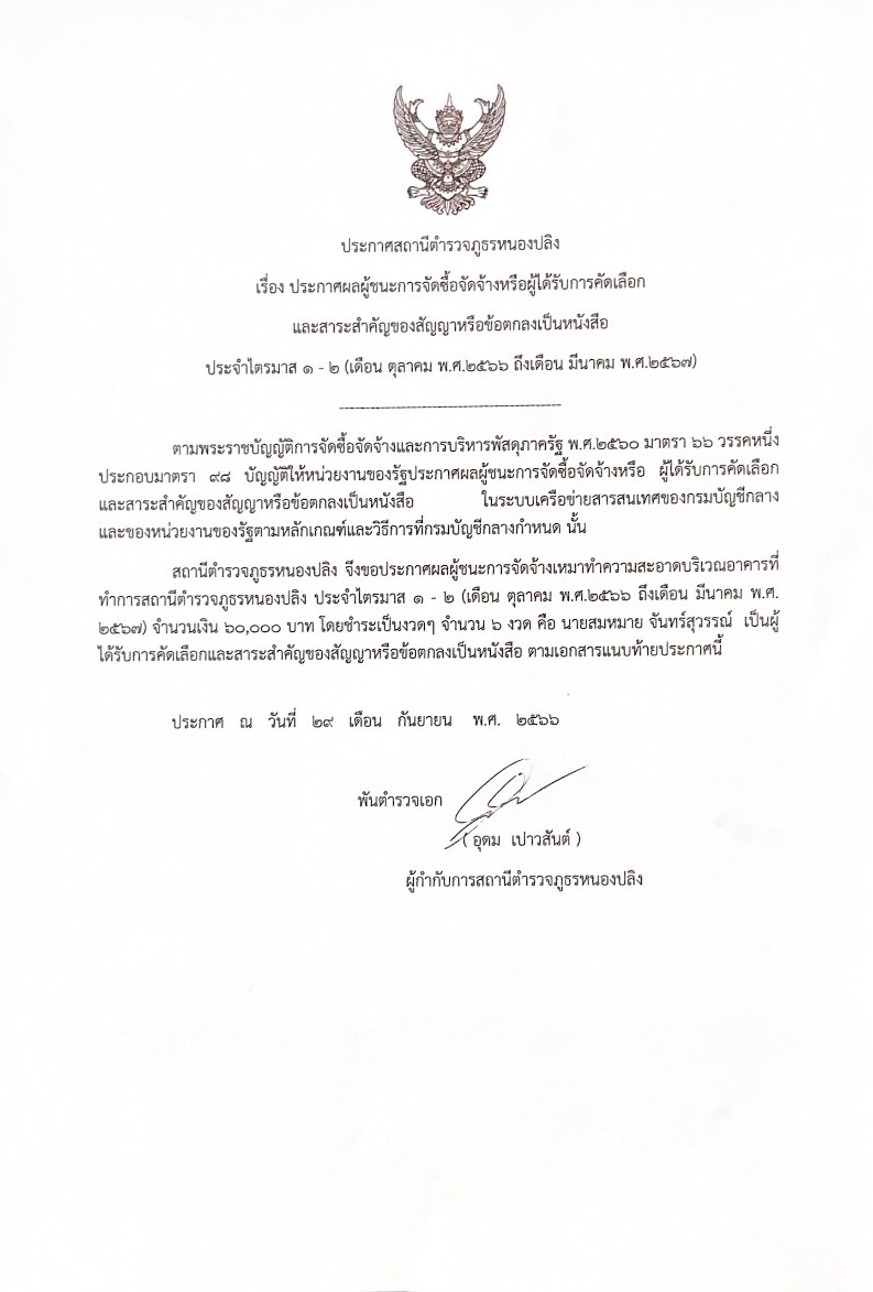 ประกาศสถานีตำรวจภูธรหนองปลิง เรื่อง ประกาศผู้ชนะการเสนอราคาจ้างเหมาทำความสะอาดอาคารที่ทำการสถานีตำรวจภูธรหนองปลิง โดยวิธีเฉพาะเจาะจง เดือน ต.ค.66