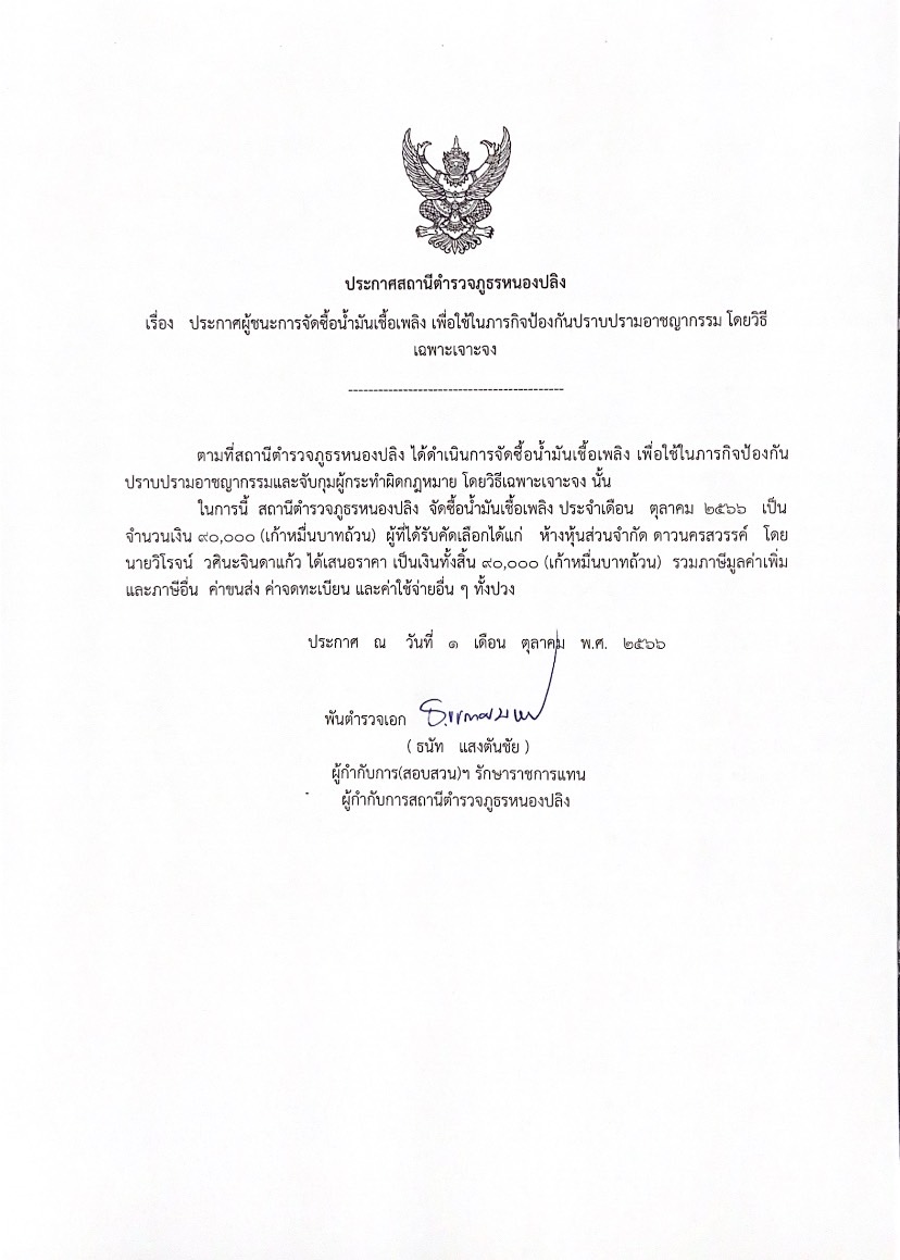ประกาศสถานีตำรวจภูธรหนองปลิง เรื่อง ประกาศผู้ชนะการเสนอราคาจัดซื้อน้ำมันเชื้อเพลิง เพื่อใช้ในภารกิจป้องกันปราบปรามอาชญากรรม โดยวิธีเฉพาะเจาะจง เดือน ต.ค.66