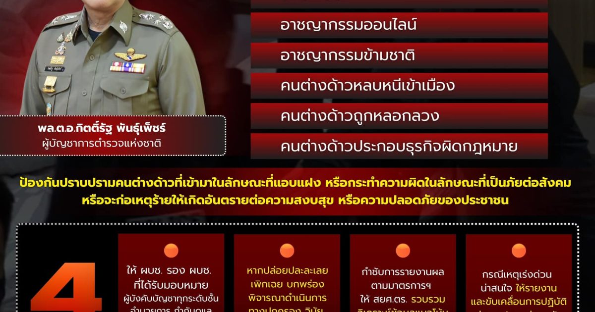 ผบ.ตร. กำชับ ตามที่ รัฐบาล และ ตร. มีนโยบายเร่งด่วนในการแก้ไขปัญหายาเสพติด ปัญหาอาชญากรรมออนไลน์ อาชญากรรมข้ามชาติ คนต่างด้าวหลบหนีเข้าเมืองโดยผิดกฎหมาย และคนต่างด้าวถูกหลอกลวงหรือประกอบธุรกิจผิดกฎหมาย
