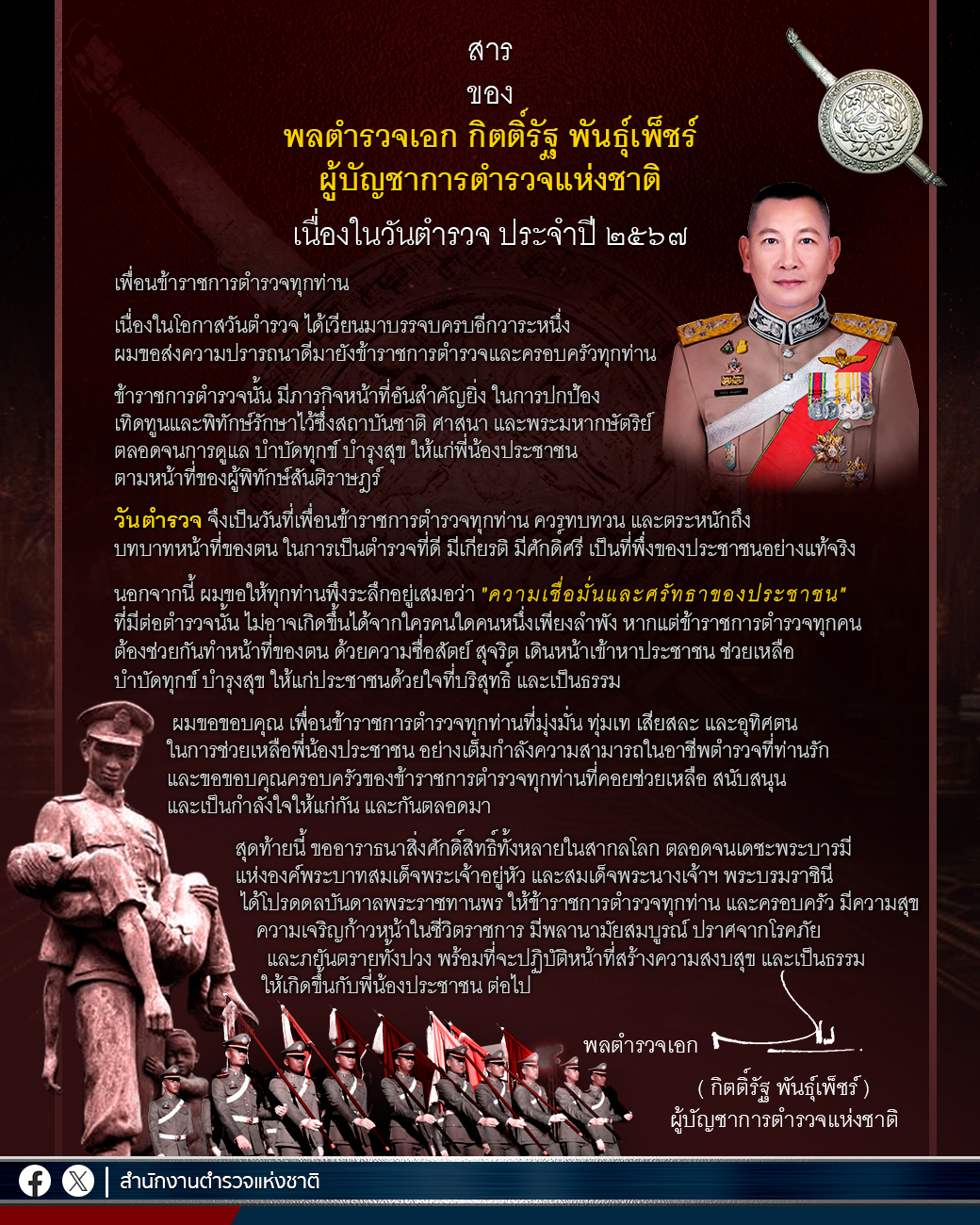 “สาร” ของ พลตำรวจเอก กิตติ์รัฐ พันธุ์เพ็ชร์ ผู้บัญชาการตำรวจแห่งชาติ เนื่องในวันตำรวจประจำปี 2567