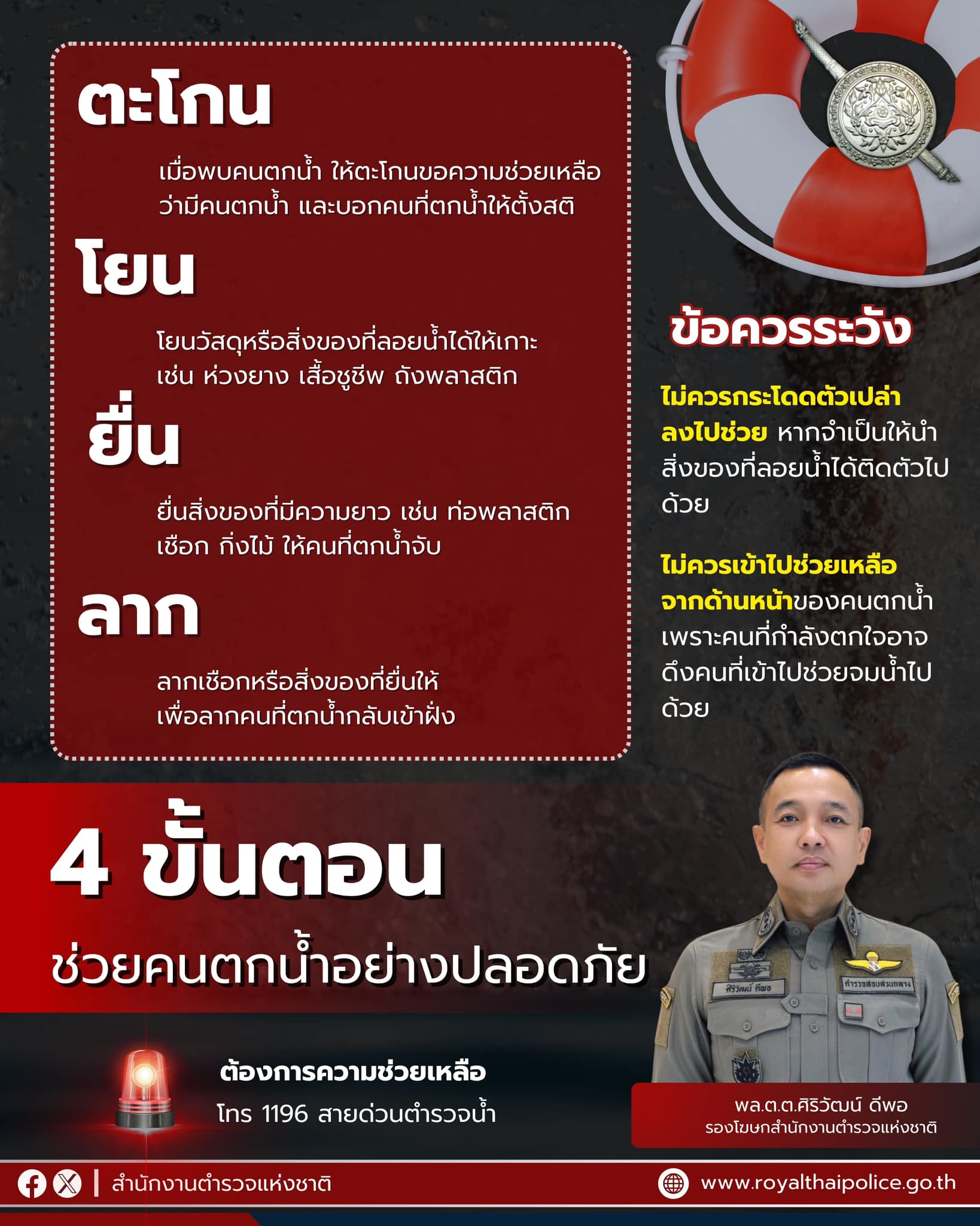 สำนักงานตำรวจแห่งชาติ แนะนำ “ตะโกน โยน ยื่น ลาก” 4 ขั้นตอนช่วยคนตกน้ำอย่างปลอดภัย . พล.ต.ต.ศิริวัฒน์