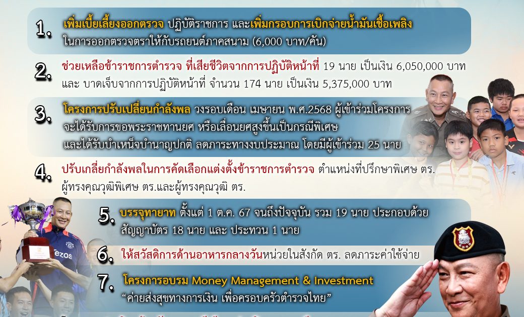 ตั้งแต่วันที่ 1 ตุลาคม 2567 ถึง 31 มีนาคม 2568 สำนักงานตำรวจแห่งชาติ ภายใต้การบังคับบัญชาของ พล.ต.อ.กิตติ์รัฐ พันธุ์เพ็ชร์ ผู้บัญชาการตำรวจแห่งชาติ มีการดูแลสวัสดิการในด้านต่าง ๆ สำหรับเจ้าหน้าที่ตำรวจและครอบครัว อาทิ เบี้ยเลี้ยง , การช่วยเหลือข้าราชการตำรวจที่เสียชีวิตจากการปฏิบัติหน้าที่ , สวัสดิการด้านอาหารกลางวันหน่วยในสังกัดสำนักงานตำรวจแห่งชาติ