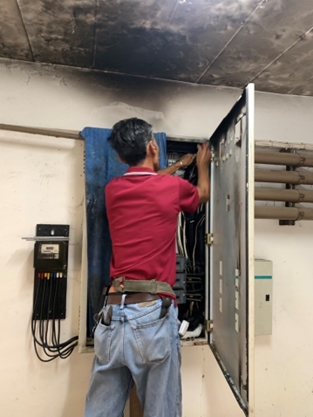 ทำการซ่อมแซมตู้ควบคุมไฟฟ้าใต้ถุนแฟลต 5 ชั้น ที่เกิดการไหม้ของสายไฟฟ้า