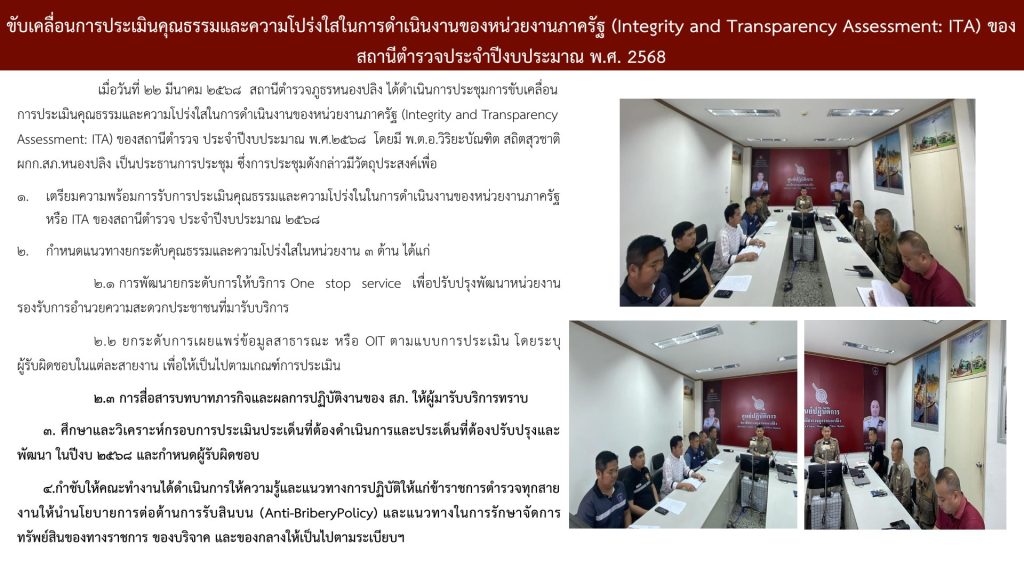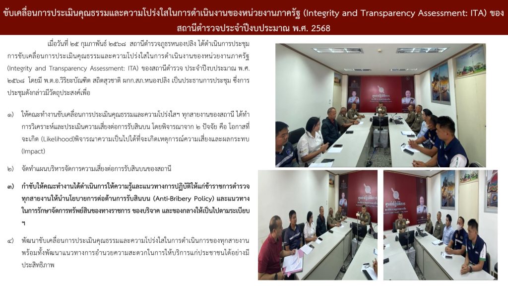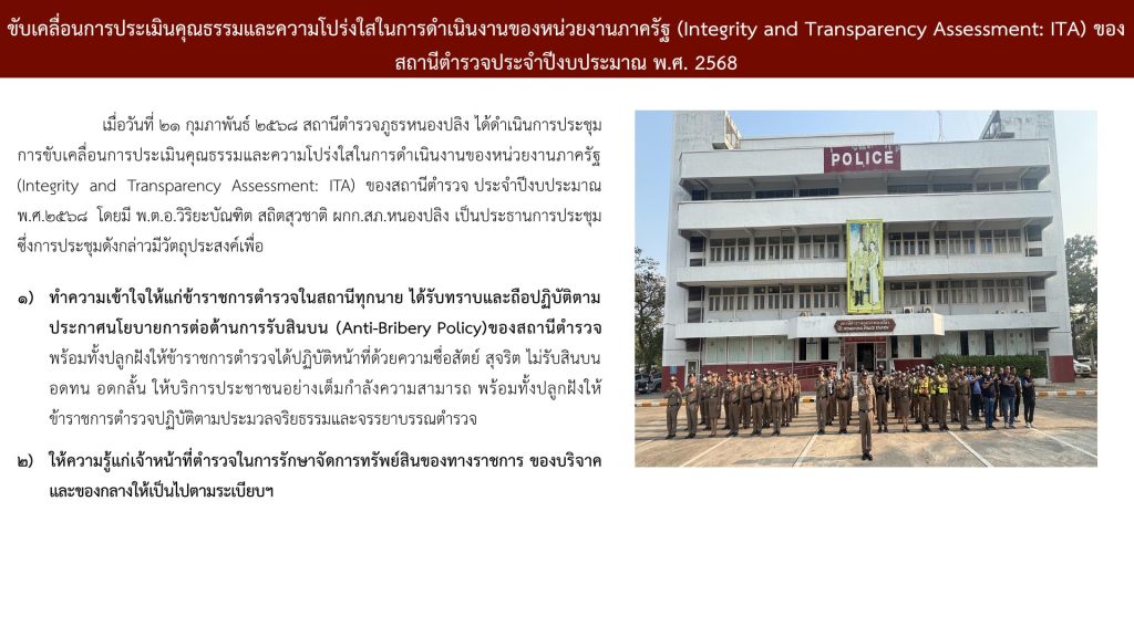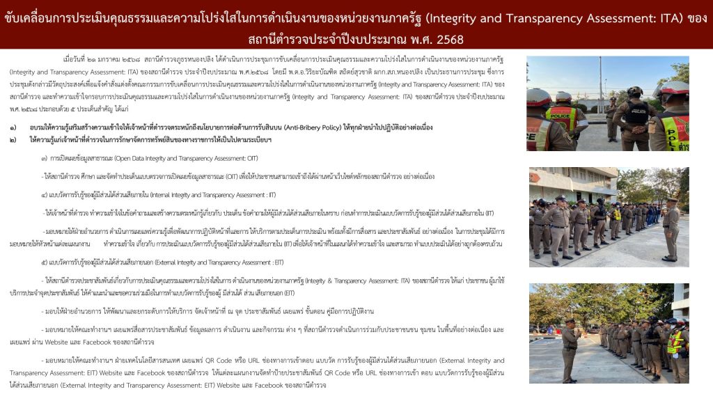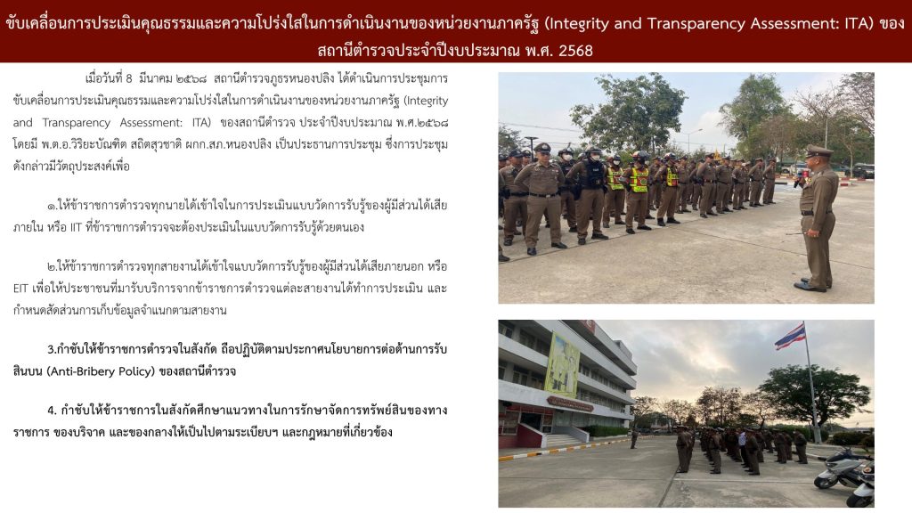 พ.ต.อ.วิริยะบัณฑิต สถิตสุวชาติ ผกก.สภ.หนองปลิง พร้อมคณะทำงาน สภ.ฯ เข้าร่วมรับฟังกิจกรรมชี้แจงการประเมินคุณธรรมและความโปร่งใสในการดำเนินงานของหน่วยงานภาครัฐ (ITA) ของสถานีตำรวจ ปี 2568 โดย สำนักงานคณะกรรมการป้องกันและปราบปรามการทุจริตแห่งชาติ (ป.ป.ช.)